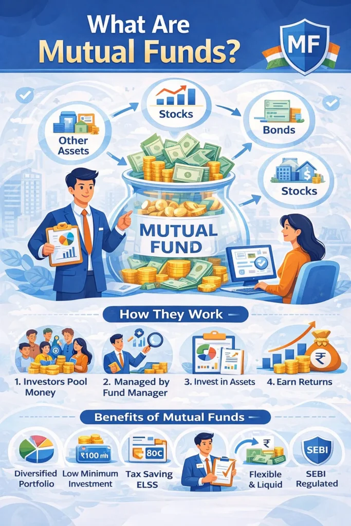 A mutual fund is an investment vehicle that pools money from multiple investors and invests it in securities like stocks, bonds, or other assets. These funds are managed by professional fund managers and regulated in India by the Securities and Exchange Board of India (SEBI).