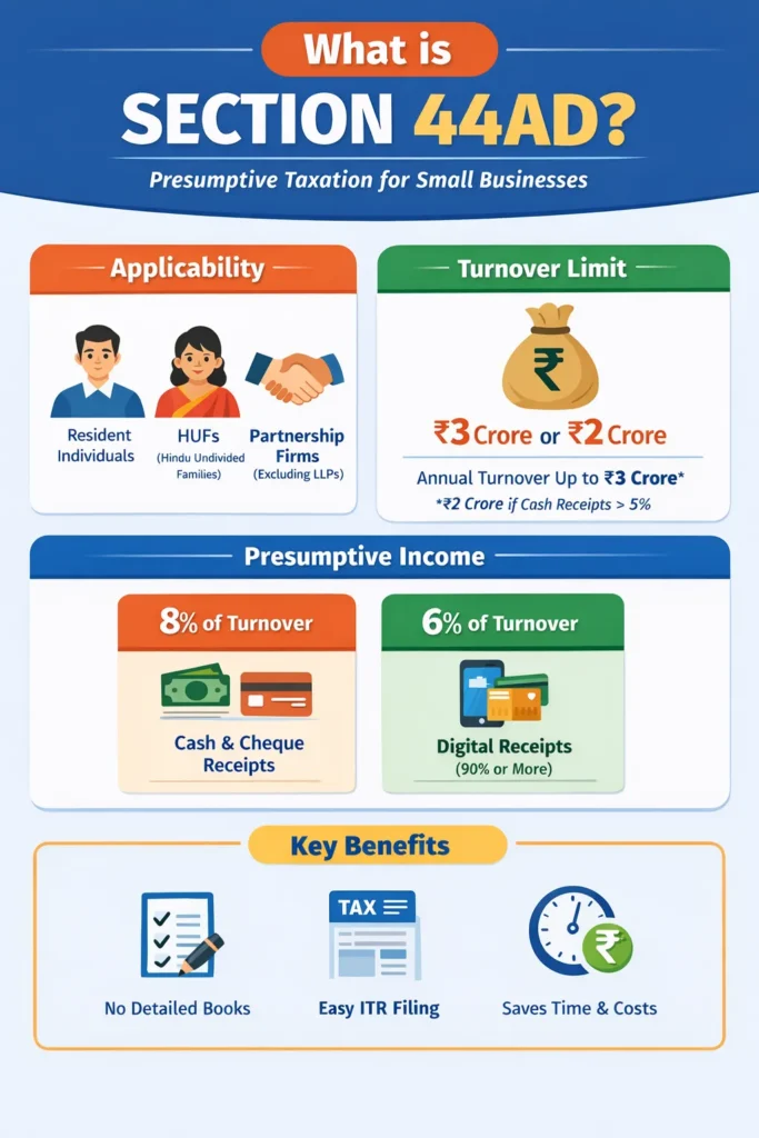 Section 44AD is a provision under the Income Tax Act that allows small businesses to pay tax on a presumptive basis, i.e., income is calculated at a fixed percentage of turnover, without maintaining detailed books of accounts.