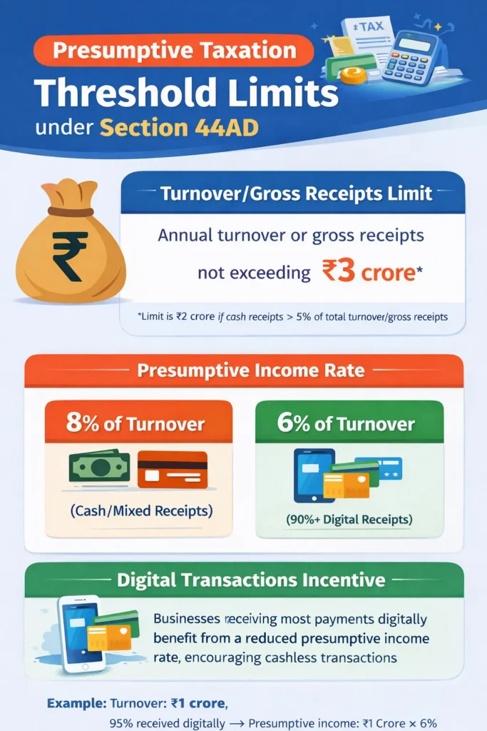 Section 44AD applies to eligible resident taxpayers carrying on business. Under this section, where the total business turnover does not exceed ₹2 crore, taxable income may be declared at 8% of the turnover. However, where cash receipts do not exceed 5% of the total turnover, the enhanced threshold of ₹3 crore becomes applicable, and income may be declared at a reduced rate of 6% of the turnover.
