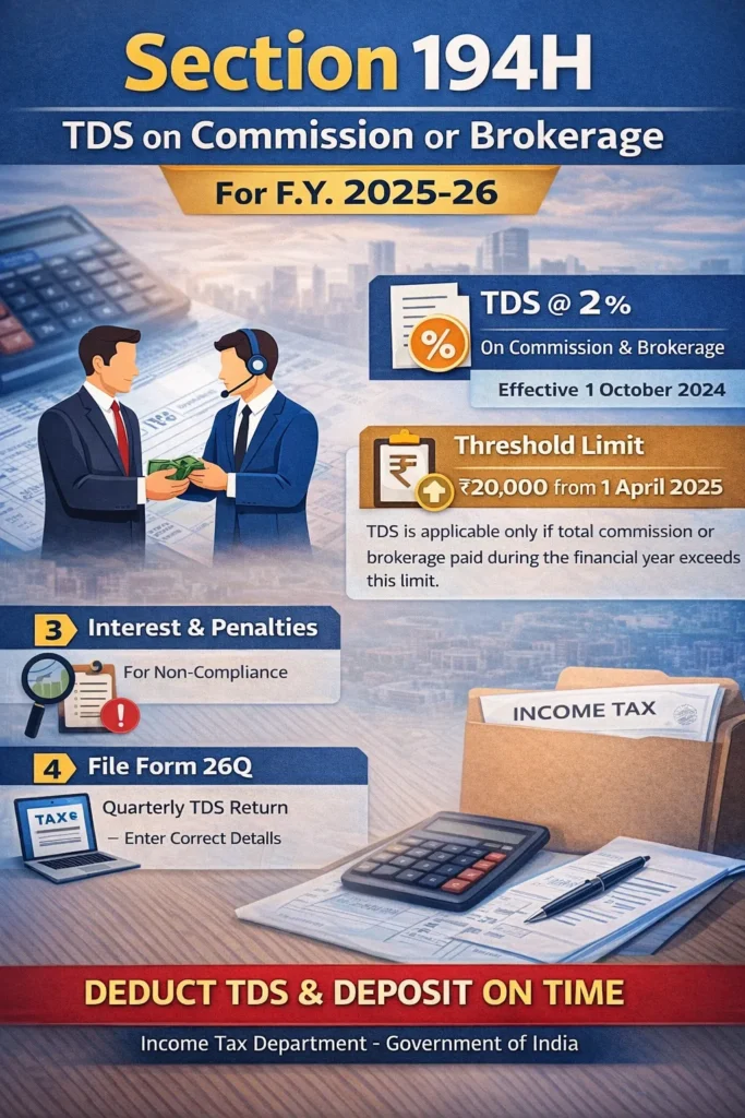Proper compliance with Section 194H of the Income-tax Act, 1961 is essential for businesses and individuals making commission or brokerage payments. Timely deduction and deposit of TDS not only ensure smooth financial operations but also help avoid interest, penalties, and disallowance of expenses. Below is a clear step-by-step guide to calculating and depositing TDS under this section.