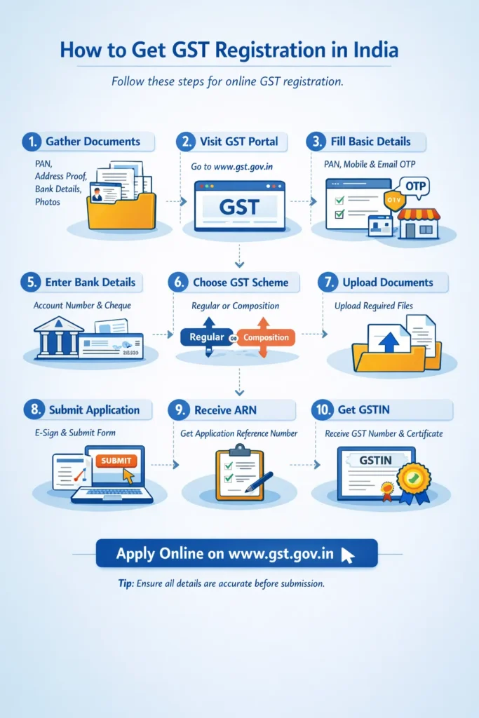 GST registration can be completed fully online, making the process convenient and quick. Follow these steps: