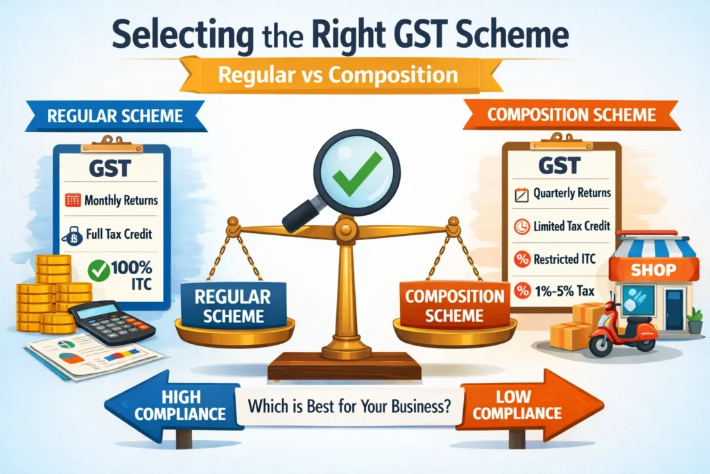 Under the Goods and Services Tax (GST) framework, businesses in India can choose between two primary schemes: the Regular GST Scheme and the Composition GST Scheme. Selecting the right scheme is essential, as it directly impacts tax liability, compliance requirements, pricing strategy, and business growth.